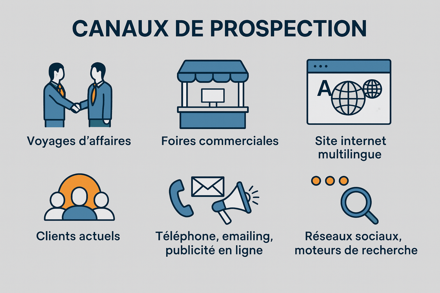 Les relations avec les clients actuels, le téléphone, l’emailing ciblé et la publicité en ligne (réseaux sociaux, moteurs de recherche) sont autant de canaux à considérer pour une prospection à l’international optimisée, permettant de cibler des groupes spécifiques selon l’âge, la fonction ou la région.