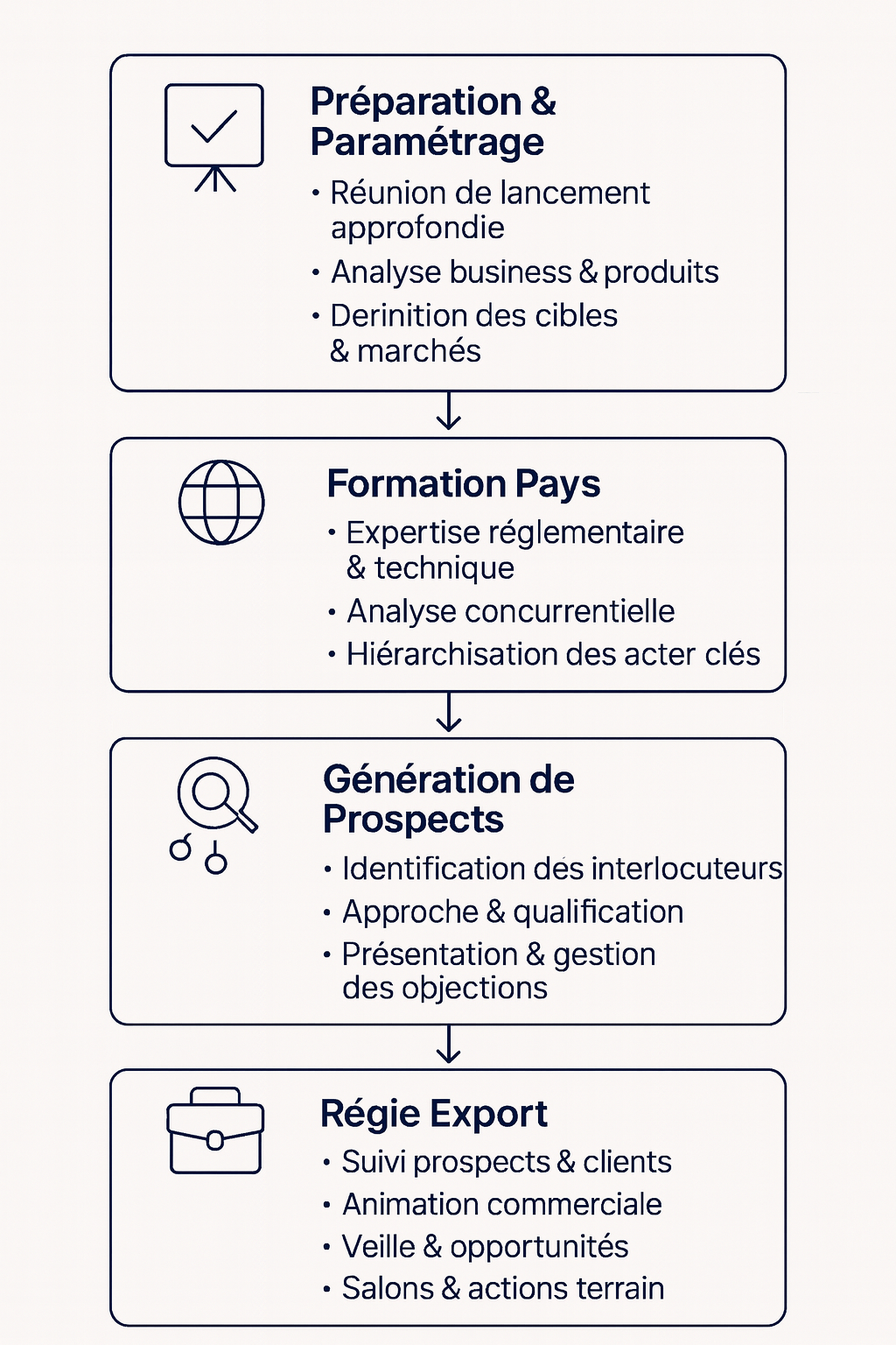- Préparation et Paramétrage : Une réunion de lancement approfondie avec votre équipe pour comprendre les fondamentaux de votre business, vos objectifs et votre calendrier. Cette phase inclut la présentation de votre entreprise, de vos gammes de produits et savoir-faire, le partage de votre expérience à l’international, la revue des marchés visés et de leurs spécificités, la définition des critères des clients cibles, la revue des outils marketing existants et l’adaptation des supports en langue et culture locale, ainsi que la mise au point d’un narratif commercial adapté.